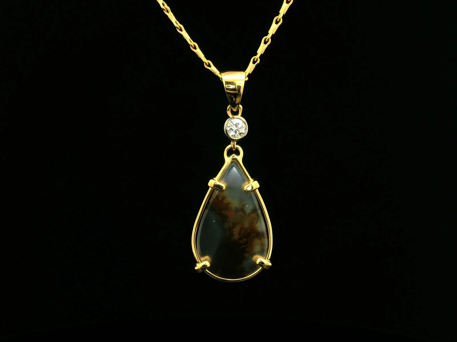 This exquisite teardrop pendant necklace features a stunning dendritic agate encased in a delicate gold setting. The pendant hangs gracefully from a fine chain, complimented by a round brilliant cut diamond, making it a perfect statement piece for any occasion. Its unique design and elegant craftsmanship make it a must-have addition to your jewellery collection.